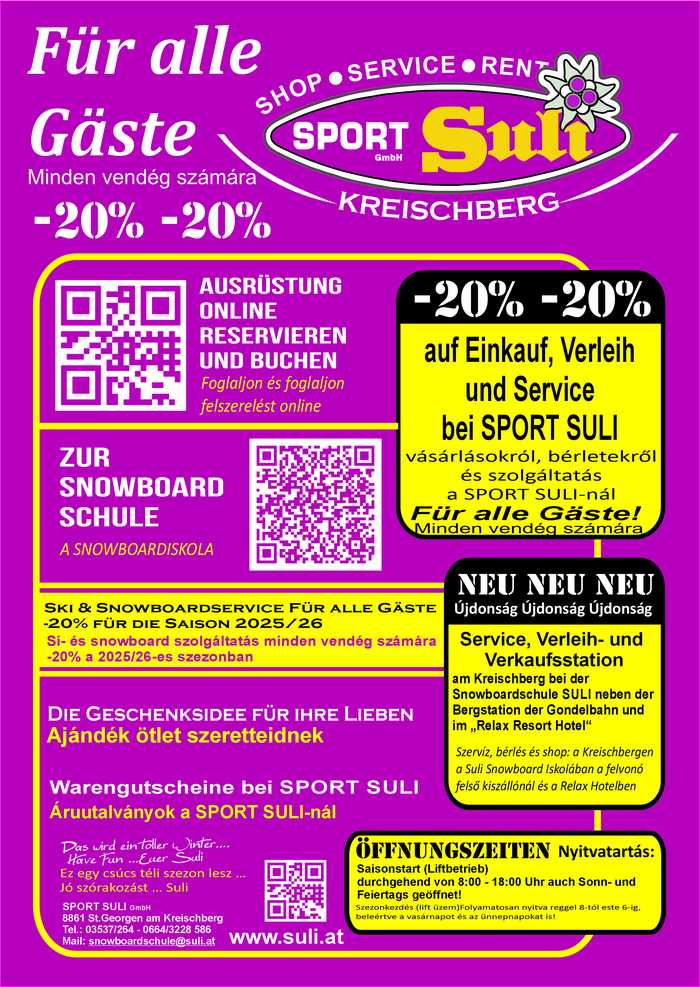 Hóbiztos síelés és snowboardozás Stájerország szívében. Szállodánk 450m-re található a kreischbergi felvonóktól. Ez a modern felvonó 1600 méterről 2050 méterre viszi fel utasait. Így a síelők a Bergstation-tól már kényelmesen és gyorsan érhetik el Rosenkranz csúcsát vagy akár a Sixpack-et.
